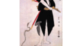この三枚は続き絵ではありませんが、同一戯曲中の人物と考証され、構図も何か呼応し合う気分をもつので併陳しました。寛政六年五月都座『花菖蒲文禄曾我』の人物で、11図は三代沢村宗十郎の大岸蔵人、12図は三代坂田半五郎の藤川水右衛門、13図は二代坂東三津五郎の石井源蔵。それぞれ捌き役の義人、強悪な敵役、悲命に発れる実方等の役所が巧みに描き分けられています。絵本番付によると、蔵人と水右衛門が祗園町で碁を打つ所へ蛇が現れる場面が11・12図に相当するらしいです。温和だがシンの強い宗十郎の振り返ったポーズに動感があり、服装や扇など、写楽のこの同一役大首絵と比較すると興味が倍加します。半五郎の憎体な、しかし何か線の細い芸質もよく表現され、怪奇な構図は「蛇侍」の異称が与えられています。