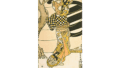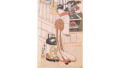 三十六花撰と洒落て、王朝の和歌・三十六歌仙を略しました。これも春信らの古典時様化で強くうち出された発想法で、遊里はまさに江戸町人にとっての玉楼の寝殿造り、遊女は光源氏が愛した大宮うちの女たちになぞらえもしました。うつせみの哀れと観ずれば、馳染のやさ男と袖にしのんでかたく結ばれ、女の館を添うていま立ち出でようとするに、青簾の奥からなんぞ声あってかえりみる……情緒纏綿です。衣文の流れるような暢びた線、棒縞こまかにたゆとう裳すその乱れ、恋情さらにたえ難くします。
