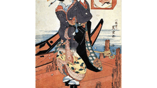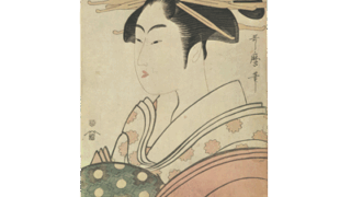古く枕草子に「ひろき庭に雪のふりしきりたる」風情を「めでたきもの」にかぞえ、源氏物語の橿の巻にも「童おろして、雪まろぱしせさせ給ふ」と見えるように、雪への親しみは、伝統的に日本人の心を貫流しています。雪まろばしは、江戸期では雪まろげ、雪ころがしなどと言い方を変じ、さらに雪こかしが一般化した称となっています。雪の小さい 塊をころがしてゆき、しだいに大きな円塊にするたわむれのことをいいます。江戸市中でも行われたことは、『東都歳事記』(斎藤月岑著、天保九年)巻四冬の部十一月、看雪の項中に 「雪をもって市街へ達磨布袋其余色々の作り物をなします。又雪転の戯等諸国に替らず」とある文にその状がしのばれます。豊国は楚々とした寛政美人の姫君が侍女たちの雪こかしを賞でる様を描きました。各図に三人ずつ配した美人が有機的関連を見せ、リズム感を催させる構図と美麗ないろどりが快いです。雪の日特有の、引きしまったさわやかさも感じとられます。