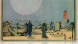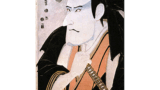 役者の日常姿の描写は、すでに歌川豊国が筆を染め、鳥居清長や勝川春潮も手がけています。豊国の長大判に役者と美人を取り合わせたシリーズは、この種の作品中目の惹かれる佳品を揃えています。総図数は不明ですが、掲出二図の他に「鞠を蹴る瀬川菊之丞」・「坂東簑助の月見」「酒盃を手にした市川男女蔵」「楽屋の中村伝九郎L(第175図)等が判明しています。この伝九郎は寛政十一年八月に没していますから、このシリーズの制作はこれ以前、落款から寛政十、十一年頃と推定されます。シリーズ中では「夜船の宗十郎」が佳品。猪牙舟の矩燧にうずくまる宗十郎の姿に夜気の冷えを覚え、梅橋に立つ舟宿か料亭の女のもつ提燈の光が閥を切って照らす状が版画技法の面白味を見せています。簾を掲げて湯上がりの美人に話しかける高麗蔵の図は、雰囲気描写がよいでしょう。