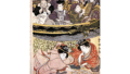 雪月花は、四季の変化に富む日本の伝統的な自然美の象徴。早くから画題にとられ、また三つ組みや三つ揃いの趣向として見立てられます。浮世絵には類例がはなはだ多く、掲出図もこの見立系列に属します。それぞれ職種を異にする三美人を配して変化を図り、花は町芸者、月は花魁、雪は辻君を描きます。爛漫と咲く桜花の下、延鏡で顔をなおす芸者の姿が荊郷つぽい。図案化した干鳥を散らした裾模様が、いかにもこの女性の好みを表し、江戸前の機知のなかに思わぬ近代味を見せておもしろいです。特に顔つきが写生にもとずいたらしく、ふしぎな個性味を宿しています。花魁は月下弾琴図の当世風見立のおもかげが見られます。打掛けの萩の総模様が月光に映える萩の野を思わせます。辻君は本所吉田町辺の者ですか。白手拭いをふきさらし、つぼめた破れ傘を片手に、辻行燈の前に雪を踏んで立った姿は、文化期特有の凄艶味を発揮しています。