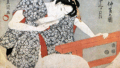 集中の優れたものとしてここでは「仲夏の図」を抜きました。仲夏は陰暦五月の異称。夏の半ばで、今ならさしずめ六月頃に当たります。長雨時の湿度はまだ残り、やがて夕立や雷の季を迎える時期で、そのような季感がこの絵の画調からうかがえます。燈を消したうっとうしい闇の蚊帳から抜け出た美人が、階段の降りロから下をのぞくポーズをとらえ、たくし上げた着物と白い腕に夏を感じさせます。ロをおおった懐紙の端にちょっぴり付いた口紅の痕が、妙にこの絵の色気を増しています。裏面の蚊帳内、煙草盆から突き出た煙管が蚊帳にふくらみをもたせ画面を締めています。午字の検印と方形の極印があるので文政五年の作と判定されます。