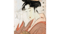 これは国政の七分身美人中、最も動きのある絵。同じ版元でこれと向き合う形の七分身美人図があり、裳小紋の衣裳で、三味線を低目に持って弾じていますから、一対作品として誰かをモデルに作ったものかもしれません。こちらの美人の衣裳が縦縞の模様にしてあるのも対比を考えたものかと思われます。画面全体に大きくくの字なりに収めたポーズがしっくりとあてはまって安定感があります。三味線の転6 を支える手つきに力感があり、写生観察の鋭さを思わせます。砥めてしめりをくれている三味線の糸が、支えた指を境に、片方は幾分張りを見せ、他方の末端にはちぢれを見せている描写が何とも細かく、ここにも写実に徹しようとする国政のゆきとどいた観察眼と、これを表現した一種の野心的意欲が端的にうかがえます。作画期は前図同様寛政八年頃。