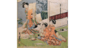 題の和国景夕は、他の類似題に和国景跡の字を用いていますから、もちろんこの誤用でしょう。単調感を覚えさせる屋外の浮絵を制作してきた豊春は、屋内と、その屋内の窓格子を境とする屋外とを無理のない遠近法で接着させて、画面に変化を与えるよう努めています。屋内は題から見て品川の妓楼でしょう。遊女の髪型が張出し方の強い燈寵髪になっていますから、安永も大分はいった頃らしいです。遊客たちはその顔がそれぞれ特徴を見せて描かれているところを見ますと、通人か何かモデルを写したものと思われます。人物が彼の常の浮絵より大きめのことも、こういう想像を起こさせます。屋外は品川の海ですが、その海面が心持湾曲して描かれている点、よくいわれる地動説を聞きかじり、地球であることを知った所産とも受け取れますが、あるいは見たままの感じで写生したかもしれず結論は出しにくいです。豊春としてはこれまでの密画的遠望描写から対象を整理して選び、やがて発達する風俗画的風景画の生まれる前駆的作品といった感が強いです。