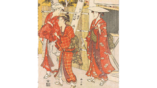 国安の感受性は鋭いです。筆も切れるように立ちます。その彼が、文化末年、最も脂の乗り切った時期の制作で、おそらく彼一代の傑作と見られる雪月花の三幅対をここに紹介します。題材に選ぶ美人や背景に彼ははなはだ気をつかったあとが見えます。花は隅田の夜桜に芸妓、その襖橋付近の情景から、いわゆる「上手」と称される隅田川上流のあたりらしいです。ものういような春の朧夜の風情をここまで描き込んだ作品は他に求めがたいです。はらはらと散る花びらにも詩があります。月は川をずっと下にくだった鉄砲洲付近、佃を望む水上の笞舟に一人月を眺める船饅頭。夜寒に懐手して襟にあごを埋めたじだらくなポーズが何ともいえず、風情と凄味とを渾溶した作品。月光に映える海面の描写も迫真感があります。雪は吉田町辺の夜鷹でしょう。抱えた菰にそれと知られます。踏みしだいた雪上の下駄のあとに寒さを感じ、夜鷹のポーズもよいですが、前二図の卓抜さの前には一等を輸します。雪の降り方の規則的な描写がこの絵の感銘を幾分薄めています。