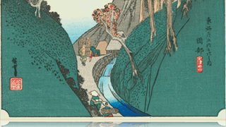 国安の感受性は鋭いです。筆も切れるように立ちます。その彼が、文化末年、最も脂の乗り切った時期の制作で、おそらく彼一代の傑作と見られる雪月花の三幅対をここに紹介します。題材に選ぶ美人や背景に彼ははなはだ気をつかったあとが見えます。花は隅田の夜桜に芸妓、その襖橋付近の情景から、いわゆる「上手」と称される隅田川上流のあたりらしいです。ものういような春の朧夜の風情をここまで描き込んだ作品は他に求めがたいです。はらはらと散る花びらにも詩があります。月は川をずっと下にくだった鉄砲洲付近、佃を望む水上の笞舟に一人月を眺める船饅頭。夜寒に懐手して襟にあごを埋めたじだらくなポーズが何ともいえず、風情と凄味とを渾溶した作品。月光に映える海面の描写も迫真感があります。雪は吉田町辺の夜鷹でしょう。抱えた菰にそれと知られます。踏みしだいた雪上の下駄のあとに寒さを感じ、夜鷹のポーズもよいですが、前二図の卓抜さの前には一等を輸します。雪の降り方の規則的な描写がこの絵の感銘を幾分薄めています。