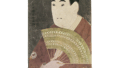 軒先に引掛けた灯人りの提灯で、その照らすおぼろの光を想像させ、詩趣もほどよく漂います。着衣の藍染めの縁に施した板ぼかしの技法が、質感表現に、またはなはだよく効いています。