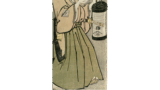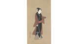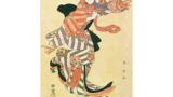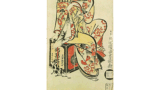 七小町とは、平安朝の佳人小野の小町にまつわる挿話・俗説が、いつか七種にパターン化されて民間に親しまれ、画題ともなったものです。草子洗小町・雨乞小町・通小町・清水小町・関寺小町・鸚鵡小町・卒都婆小町の七をいいます。浮世絵には特に多く用いられ、その大部分が、江戸庶民らしい美人風俗の見立ての図様に置きかえられています。この図もその一つ。吉原の名妓の艶姿に七小町の俤をオーパーラとフさせた所が鑑賞の主眼となります。雨乞小町の原話は、天下早魁の際、小町が神泉苑で「ことわりや口のもとならば照りもせめさりとてはまたあめが下とは」の歌を詠み、その徳でにわかに大雨をふらせたという話。コマ絵は駿雨に波立つ神泉苑の景。柱に凭れる文政期美人の洗い髪は小町のおすべらかしの髪型になぞらえ、手にして見人る玉章は、和歌を記す短冊、そしてしどけなく引っかけた表服は十二単衣にそれぞれ見立てられています。模様の天翔る応竜が題材によく合い全体にスッキリとした新鮮な画調と色気とが、快い効果を見せています。