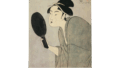 国貞の役者似顔絵は初期ほど燃えるような意欲と活気とを感じます。とりわけこの題の大首雲母摺りシリーズの迫力はすさまじいです。文化十一年頃の作らしく、この年に近い上演当たり作の人気俳優の舞台姿を描いています。現在当図と八百屋お七(岩井半四郎似顔)、猿廻し与次郎(中村歌右衛門)、大工六三郎(尾上松助)、梶原源太(坂東三津五郎)、阿古屋(中村松江)、幡随院長兵衛(松本幸四郎)の六枚が知られています。当図は七代市川団十郎の菅丞相すなわち菅原道真を描いたもの。文化十一年十一月市村座上演『世界花菅原伝授』中の一場で、筑紫に配流された道真が藤原時平の謀叛を知って憤怒し、一念宙神と変じる所です。生来眼の大きかったこの俳優が更にみひらいた眼光に凄気が宿り、くわえた梅花も火と変じる感を見事に描出しています。バックの雲母摺りもこの際、特に電光に映える趣を呈し、はなはだ効果を出しています。力作というにふさわしいです。