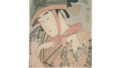 お高祖頭巾と合羽で身支度を十分に固めた二美人のポーズを、一人は傘をすぼめ、他は一杯に広げて、それぞれ向かい風の雪道で行きなやむ状を描き分け、しかも両人のポーズの作る線が右から左へとうねりを見せています。そしてこの運行をとどめるかのように、左から来る美人が迎えに応じています。