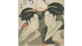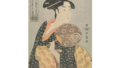 お高祖頭巾と合羽で身支度を十分に固めた二美人のポーズを、一人は傘をすぼめ、他は一杯に広げて、それぞれ向かい風の雪道で行きなやむ状を描き分け、しかも両人のポーズの作る線が右から左へとうねりを見せています。そしてこの運行をとどめるかのように、左から来る美人が迎えに応じています。
