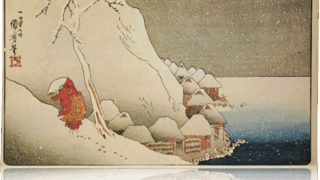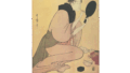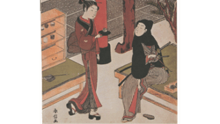 紫の曙染めの着付けの、白くトンボを抜いた地味な裾模様に対し、帯の華美な更紗模様のエキソチックな気分とが好対照を形作ります。芸妓の腕にかけた薄藍染めの手拭いに「みつ」と白抜き文字のあるのは彼女の名前らしいです。この図と同じ版元で、同じデザイン枠のコマ絵をもつ一図がなおあり、女性は年増で「こう」と記し、障子の隙から雪景色を眺めています。両者対をなすものか、他になお花の図でもあるのか、ともあれ、若い国芳の意欲作という名に値する図柄です。