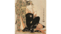 同じ隅田川でも両国橋・吾妻橋間は浅草川と呼ばれ、沿岸の浅草蔵前に幕府の米介がありました。舟運によって集まる諸国からの年貢米を川筋から引き入れる堀が八本あり、順を追った番廿名が付けられていましたが、その四番堀と五番堀との間の川岸に、川の上まで枝を伸ばして繁茂した松、通称首尾の松がありました。名のいわれは川を洲航し、吉原に向かう猪牙舟の客が、この辺りで、今宵の良首尾を念ずるところから名付けられたとも、帰りの客がここに舟をつないで昨夜の首尾を語ったからだともいわれます。浮世絵では通常この松が主題に描かれますが、国芳は逆にこの松を遠くに置き、近景の石垣の一部や、河中の石を極度にタローズアップしました。秋田蘭画の画家の視覚と一脈通じるこの手法は、天保期の浮世絵とは思えぬ清新な近代味をただよわします。石垣の隙間に顔を出す蟹、石の頂にへばりついた船虫の姿を遠景人物より大きく描いたところなど正に現代のカメラアングルの感覚です。濃淡の青い雲のたなびく空を背景に、一輪黄色い花が垂れた効果が鮮烈な印象を与えます。