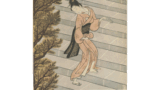 種々の解釈や想像説がこの図に付されていますが、国芳の発想および取材源は、明らかに山東京伝作・初代歌川豊国画の読本『善知安方忠義伝』(文化四)挿絵の数場面です。天慶の乱に誄されたf将門の遺児滝夜叉姫が、亡父の遺構、下総猿島の相馬の古御所に龍もり、妖術を修得して謀叛の将兵を集める企てを、智勇の士大宅太郎光国が挫く筋立で、その古内裏の場面には、破れ御簾、属難の乱戦などが描出されています。弘化頃からしだいに増大する国芳の奔放な想像力は、この幻妖味濃い題材にヒントを得て、三枚続きというワイドスクリーン形画面一杯に跨がる大爛難の怪へ発展させ、その奇想は兄る者を瞳目させる。しかし荒唐無稽に見えるこの屑雌の姿には、意外に西洋解剖学書を参照したらしい正確な描写を見出し、却てその斬新さに驚かされます。前面の歌舞伎がかったポーズの人物たちと対比して、その精緻な自然科学的な取り扱いが、さらに冴えて感じられてくる不思議な作品です。