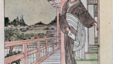 おそらくは料亭の裏木戸あたりの風情と受け取れます。黄昏時、焔幅が飛び交う夕月夜の下、送りの提燈に足もとを照らされつつ、常夜燈の前を、小棲をとった芸子が、音曲の抜き本らしい小冊を手に、低唱しながら歩を運びます。彼女を待ち受けて空駕龍に凭れ、霞小紋の羽織を抱えた黒襟の女は、茶屋の女房でもありましょうか。そしてそのうしろには、芸子の妹分らしい、やや年若の女が控えて立っています。月はこの三人と駕寵と、そして駕履わきに愛くるしくうずくまる仔犬の、それぞれの影をクッキリと地面に映し、さわやかな良夜の感覚が、この絵一面にみなぎっています。英泉の洗練された感覚は、描写に過多も不足もなく、まったく必要かつ十分な素材を適所に布置して、しっとりとした情緒をただよわせたこの優品を産み出しました。江戸末期の花柳情調を、ここまで的確に描写した作品は少ないです。英泉の腕に油の乗り出した文政五年頃の制作、彼の三枚続き作品中、私は第一に推す秀作です。