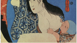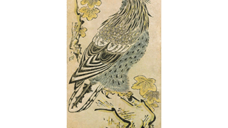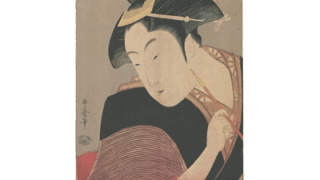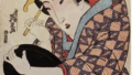 この図の雰囲気は、上部拓本風の賛の字の暗示を味読することにより、ぐっと濃密化します。辞句は「万点水螢秋草中」で、これは『和漢朗詠集』夏の一節に見え、原拠は全唐詩の許渾作の長詩篇。朗詠集では郭公の題下に「一声山鳥曙雲外。万点水螢秋草中」の二句が引かれています。山鳥はホトトギスの意。晩夏の暁、起き出て蚊帳を掲げ、半身を出した美人の耳に、暁雲の外に鳴去るホトトギスの一声が聞こえ、草むらの中には、チラチラと、水辺に群がるホタルの光の明滅するのが見えた、という情景。懐紙を覗かせてはだけた美人の胸もとが色気をただよわせ、萌黄蚊帳に透けて白い指を見せた版画技法が効果的です。衣服のボカシは初摺り品にあって活気を添えますが、後摺りは略しています。