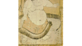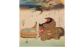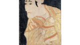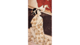 外題の読み方は、前図で説明した理由によります。副題の水茶屋は、市内の盛り場などで、客を休ませ、茶を供する店、今ならさしずめ喫茶店に相応する所です。ここに看板娘になる美女を置き、これが錦絵の題材によくとられました。当図のこの美女も、どこかの評判娘でしょう。右手にしたのは、茶碗を受けて運ぷ茶托で、この器具でこの女の職業を暗示しています。体のくねらせ方に一種独特の癖が見られますが、このポーズが後期英泉の美人画に最もよく用いられる様式で、彼の嬌艶美を規定する主要要素にもなっています。また前図にも試みられていますが、眼中を青くいろどり、下唇の先に緑を点じて京紅の玉虫色に光る効果を見せようとした工夫など、妖しい轟一惑美が、この時代の英泉の女には創出されています。噫せるような女性の体臭を執拗なまでに画中に描き込むのがこの時代の英泉でした。当図の女性の手にする包み紙は、「御かほの御薬 美艶仙女香」とあるように、京橋の坂本氏が製作販売した白粉仙女香の包みで、同店のコマーシャルです。