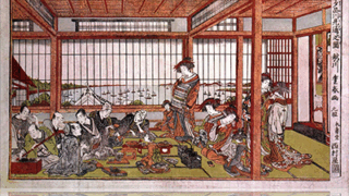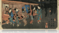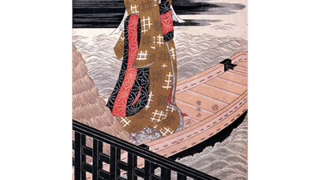 この図を右端に位置させ、中央に月、左端には華の図を配した組み物の形で、和泉屋版のこの外題の作品は、三幅対の図柄を組成します。月の図は、縁先越しに海を見晴らす座敷で髪を直す立ち姿の遊女を描き、状景から品川と見られ、華は桜樹下の縁台に腰を下ろした打ち掛け姿の花魁が花に興ずる態で、これはいうまでもなく吉原ですから、残る当図は、前二者との釣り合い上、深川の景と見られます。雪の桟橋に立つ深川芸者を描いたものでしょう。黒の塗り下駄に映える白い素足に、雪にもめげぬこの地の芸妓の心意気を見せています。胸もとにわずかにのぞかせた紐は、肌身につける懸守を吊ったものと見られます。左手でとった小棲の裾のひるがえりに、川面を渡って吹く風の強さを偲ばせ、さすがに傘をおさえる手は袖口でおおっ。た描写に写生眼の緻密と、ポーズの自然とを感じます。雪の白と、川波の青とが、美人の黒を主調とした着付けと調和して、快い味を出しています。文化前期の作品。