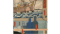 新開港地横浜に対する一般の関心は異常に高まり、報道を使命とする浮世絵師はこの地の紹介に専心しました。横浜絵はこうして多量に生産されましたが、絵師中の随一は貞秀でした。鋭い観察眼と犀利な描線による精緻な描写は、単なる報道以上に、芸術的な香気をただよわします。人物を得意としますが、器財描写にも当図のような、すぐれた作品があります。副題に示すように唐物店、すなわち横浜で営まれた外国商品の売店の陳列品を描いたものですが、発想・構図ともにはなはだ近代味に富み、この絵師のすぐれた才能を十分うかがうに足ります。前景は、びん・コップ等硬質の珍奇な調度類に、黒羅紗、おなんどびろうど、狸々緋等の軟質の舶来敷物類を取り合わせ、背景には右半に満帆風を孕んで荒浪の騒ぐ沖合を走る異国船を描いた銅版油絵、左半はおだやかな洋上に煙を吐いて浮かぶ蒸気船と短艇を扱った油浮絵彩色画(おそらく油彩画)と、硬軟・動静の対比が澄んだ色調で快く表現されています。