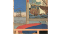 新開港地横浜に対する一般の関心は異常に高まり、報道を使命とする浮世絵師はこの地の紹介に専心しました。横浜絵はこうして多量に生産されましたが、絵師中の随一は貞秀でした。鋭い観察眼と犀利な描線による精緻な描写は、単なる報道以上に、芸術的な香気をただよわします。人物を得意としますが、器財描写にも当図のような、すぐれた作品があります。副題に示すように唐物店、すなわち横浜で営まれた外国商品の売店の陳列品を描いたものですが、発想・構図ともにはなはだ近代味に富み、この絵師のすぐれた才能を十分うかがうに足ります。前景は、びん・コップ等硬質の珍奇な調度類に、黒羅紗、おなんどびろうど、狸々緋等の軟質の舶来敷物類を取り合わせ、背景には右半に満帆風を孕んで荒浪の騒ぐ沖合を走る異国船を描いた銅版油絵、左半はおだやかな洋上に煙を吐いて浮かぶ蒸気船と短艇を扱った油浮絵彩色画(おそらく油彩画)と、硬軟・動静の対比が澄んだ色調で快く表現されています。