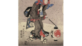 人岸蔵人は即非分別をわきまえ、石井源之丞、半二郎の兄弟に力を添えて、父の仇遠州浪人藤川水右衛門を討たせ、無事本懐をとげさせる義人の役柄です。この絵はよくその風格を表出して、捌役としての貫禄を十二分に示しています。宗十郎を評した言葉に「温和の内に底に烈しき所あり」とありますが、この宗十郎の性格からすれば、大岸蔵人の役はまさに適役であり、両頬から顎にかけての顔の輪郭線そのものが、彼の性格を心憎いまでに表現しています。前方の手、中間の扇子、後方の顔面との三者を巧みに構成して、おのずからなる遠近法を生じ、画面に奥行きをみせて平凡な構成に抑揚をつけているのも写楽手法の一つとみてよいでしょう。