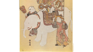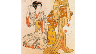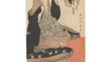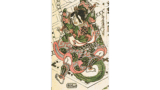 扇に描かれている図案は「観世水」と呼ばれ、沢村家の染模様で、描かれている役者が沢村宗十郎であることを示しています。狂言中第五幕の「紋所の取違(い)は祇園町の立ち合いに寄 大尽の髪披」の場を描いたものでしょう。