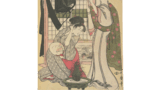 鬘のほつれに、鉢巻に、文蔵の難苦の生活を助ける妻の姿がよく表わされています。しかしそのなかに美貌と女らしい演技で群を抜く菊之丞の華麗ともいうべき容姿が現れ、劇的表情ももちろん出ていますが、どちらかというと菊之丞自体のムードが横溢しています。