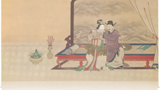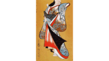 寛政元年(1789)「極上上吉」に進んだ菊之丞は、翌二年冬、中村・市村両座を兼ね、その収入は年千八百両になったといわれます。地芸と所作ともに巧みで「女による物一つとして情のうつらざる事」なく「色情を専と」して娘方、傾城など色女形を得意としました。背景の黒雲母に対する雲母を引いた白い襟はひときわ目を引き、その白襟と草色・紅色の下着の色がまた美しいコントラストをなし、画面にはなやかさを与えています。紋番付によると菊之丞の定紋は、丸に七五三の結綿ですが、七七三になっています。また細判の「傾城かつらぎ」の菊之丞の紋は上下ともに五つに描かれています。紋の描き方に不確かなところがみられます。