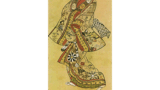寛政元年(1789)「極上上吉」に進んだ菊之丞は、翌二年冬、中村・市村両座を兼ね、その収入は年千八百両になったといわれます。地芸と所作ともに巧みで「女による物一つとして情のうつらざる事」なく「色情を専と」して娘方、傾城など色女形を得意としました。背景の黒雲母に対する雲母を引いた白い襟はひときわ目を引き、その白襟と草色・紅色の下着の色がまた美しいコントラストをなし、画面にはなやかさを与えています。紋番付によると菊之丞の定紋は、丸に七五三の結綿ですが、七七三になっています。また細判の「傾城かつらぎ」の菊之丞の紋は上下ともに五つに描かれています。紋の描き方に不確かなところがみられます。