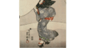 所蔵:オットーリーゼ「赤橘枠」と愛称される作品です。鈴木重三氏は、従来は男女蔵十四歳のときの青年役者を描いたものとしていましたが、それより数年は経ている時のものと考察しています。そしてこれは『恋女房染分手綱』の涼みの段で、奴一平が江戸兵衛に川金を奪取される場面であるとしました。したがって第21図の「二代大谷鬼次の奴江戸兵衛」と組み物になり、鬼次の懐から手を突き出して相手に挑みかかるため肌を脱ぐ寸前のポーズと対して鑑賞すべきです。