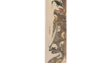 捌役の左内と敵役の官太夫のそれぞれの妻を描き、女形の善悪二人を興味深く表わしています。両人の扮装の違いにみられる役柄はともかくとして、二つ並んだ顔にその役柄の性格がよく表わされています。藤波の純情な顔つきと小笹の憎々しげな顔面描写は、それぞれ役者の写火的な顔を描いているばかりではなく、役柄をよくつかんで表わしています。