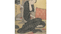 背景の黄潰しに対して、ほかは二、三色の少ない色数で画面を処理し、その配色は清楚で、しかも版形式の絵として効果を高めていることは注目すべき点といえましょう。しかし配色面を度外視すれば、まことに生気のない図柄です。この場面は相模と武蔵の国境の焼き餅坂で、笈に新田義興の一子徳寿丸を隠して通りすぎようとした六部姿の南瀬六郎宗純は、そこの馬子寝言の長蔵らの襲撃を受け、錫杖にしこんだ長刀を抜き、構えて立ち向かったのでした。この長蔵の立廻り姿も写楽は描いていますが、写実的な躍動美をよく表現した作品となっています。それに対してこの宗純の作品は、戦うものの姿としては、いかにも父魂にかけています。従来の役者絵と大差ない典型化したポーズに堕したけはいが濃厚です。写楽の個性表出の特色ある描写より歌舞伎の様式美の甘さを快く感じます。