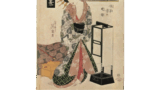 この作品は所在不明でしたが、今度その所在が知れ、現物を撮影することができました。このような理由から、保存状態は良くありませんが、あえて原色版にしました。槌色がはなはだしいですが、この作品は四枚続きの一枚であり、これらのなかのほかの作品の色を考慮して、各部分の色を書き出せば、畳は黄土色、背景の欄間の下方と床の上方に観世水の模様が描かれていますが、これは藍色でしょう。