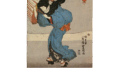 両面摺りの解説でふれたように、彼女は堅父の娘でした。難波屋おきたをはじめ、当時人気のあった女性の多くが、水商売でしたので、諸々の文献に、その人気は難波屋おきたには及ばなかったとあります。しかしおきたのその後の消息がはっきりしないのに対して、おひさは、後に亀井戸から養子を貰い、長次郎、直吉の二子をもうけましたが、早死したと伝えられます。そして歌麿の描いた「高名美人六家撰」巾の一図に、眉を剃り落とした姿の作品があります。