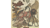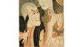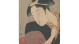歌麿は、外見的美しさよりしだいに内面的、心理的な美しさをも描くという画風へと進みましたが、この図など、湯上がりという一種の開放感にひたる女性の美しさを表現するために、髪や顔の描写にくらべ、首をはじめ身体の描写は観念的描写法をとって、顔に視点が向くような構図法をとっています。これを以前の彼の美人画と比較して、多作による歌麿型の美人画の様式化という見方もできますが、一方、ますます精巧な彫刻ができるようになった彫師の技倆を十二分に生かしたためとも考えられる作品です。