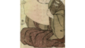 この。立兵庫”に結い上げた「野路の玉川」にたとえられた花魁は誰でしょうか。このシリーズで、歌麿は、女性の美しさを描くために一歩前進した描写法を用いています。それは顔の輪郭線を、従来の川線ではなく、肉色の線としていることです。本図でも明らかなように、従米の墨では輪郭ははっきりはするもののどこか硬い感じがありましたが、肉色の線を川いることにより、豊満なほおの質感をも出すことに成功しています。