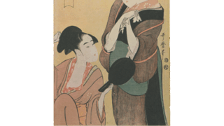 浮世絵は庶民がなぐさみものとした絵画ですから、みだらな絵が多いと一般に考えがちです。しかし徳川幕府は意外なまでに浮世絵の大衆におよぼす影稗力を重視して、種々の禁止令を出しています。しかし板元:絵師は、そうした禁止令を巧みに逆用して作画し、かえってすぐれた作品を発表しています。本図も、江之島あたりの海女を取材したと考えられますが、中央に子供に乳を与える海女の姿を描くことによって、母性愛を扱った作としたのでしょう。