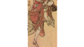 和歌で有名な六歌仙に、当代の評判美人をなぞらえたシリーズの一図です。上の判じ絵から「烏森の後家」とも、また「日の出屋後家」ともいわれています。寛政の改革によって特定の名前を記すことが禁じられ、その結果、この判じ物によって、画中の人物名を明記したのだといわれています。