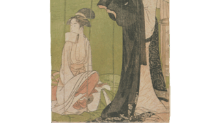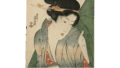文化にはいった歌麿の版画作品は、まったく様式化し、描線は硬く、配色の妙味にも欠ける画風となっていますが、こうした肉筆画を見ますと、やはり彼が当時の浮世絵界の主導権を握っていた秘密が明らかになります。描線はやや硬いですが、全体の構図および着彩の巧みさは、なお衰えていないことを知ります。