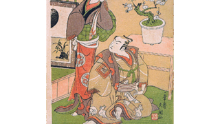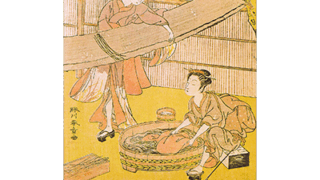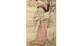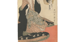 本図も重要美術品に認定されている作品です。この図とほとんど同じ構図が、彼の最晩年、文化期の作とされる「夏衣裳当世美人」中の「伊豆蔵仕入のもよう向き」で用いられています。そうしたことから本図も同時期の作かと思われます。
