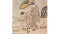 本図は、もと明和二年の絵暦として作られたものであり、商品としての錦絵に改版する際、暦の文字が書き込まれていた帯の部分を、いそいで彫り直さなければなりませんでしました。雷文つなぎの文様を抜く黒帯のいかつい調子が、綸緻に組み立てられたこの図に唯一のめざわりな部分となっているのも、こうした小情のしからしめるところと了解されて頂きます。