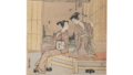 上部の雲形に「雪月花内 品川月 秋風に雲も晴行月影のひかりもたかき沖つしら浪」と記し、劣台に出て海上を見わたす男女の図を描きます。一見しただけでは春信の作品と見まがうほどに、春信様式を忠実に追っていますが、落款は「春重画」とあります。鈴木春重、のちに我が国ではじめて銅版画をつくることに成功した司馬江漢の、若き日の画名です。