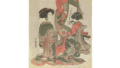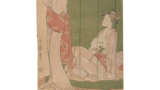 吉田瑛二氏によれば安永五年ごろから天明二年ごろまでに描かれたというこの「雛形若菜の初模様」は、老舗の西村永寿堂を板元として出された湖竜斎最大のシリーズです。連年発表された総図数は九十点を超え、のちに鳥居清長がさらに十図を加えています。。若菜の初模様”とは、その年の正月にはじめて着る衣裳の模様という意味であり、各図とも吉原の遊女がモデルとなりながら、主役となるのは彼女らの着衣のデザインです。変化に欠け、類型的な図柄が目立つ連作ですが、衣裳の模様は一つとして重なるものがないのも、作品にゆだねられたこのような性格に由来しています。まさに最新のト″プモードを伝える衣裳雛形であり、風俗の流行が多く遊里から生まれた当時の事情からみても、人々は争ってこれを購い求めたことでしょう。企画の成功が、数年連続の出版を可能にしたのでしました。淡い灰色の地に生える紅色の衣裳が美しい本図は、石鉢の金魚をのぞき込む遊女と禿の風俗もめずらしく、シリーズ中の傑作の一つです。