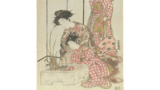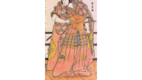 向こうから供をつれた僧侶がくる。往きちがう老夫婦の旅人が、腰を曲げて慇懃に挨拶しているもの、僧侶を敬い、後生を願う昔の老人の気配もしのばれる一情景である。掛川、つぎの袋井から浜松あたりの平野では凧あげが盛んである。沖天にあがっている凧や、糸が切れて飛んでいく凧が画面に動きを与えている。遠くに見える峻厳な山は秋葉山である。掛川から秋葉山へは32キロメートル。東海道で庶民の信仰をあつめていた三尺棒権現によって知られている。右手の田圃で田の草をとる納付の姿、橋の上の里の子に夏の暑さを見せている。僧侶の胸もとに汗がにじんでいるようにさえ見える。