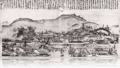 この絵は、なによりも雪のあしたの晴れた空の美しさが目をみはらす。左手の山の端の薄紅の色から沖天へ向かっての澄みきった藍の色の美しさ、清らかさ。この空が画面を対角線に区切った半分を占めている。そして、その明るさに映える亀山城から城下の町家を半分に描いているが、この静かさの中を大名行列が粛粛登っていくのが、また印象的である。雪の傑作としては蒲原の「夜の雪」もあるが、一方は陰に、一方は陽に、広重は見事に描き分けている。ここの描かれている亀山城は、天正十五年に岡本下野守の築城といわれる。