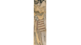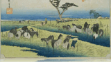 現在の千葉県千葉市の登戸浦を描いたもので、当時は江戸湾の湊で江戸築地に荷揚場を持ち、年貢米や海産物を房総半島から江戸に海上輸送する拠点の一つでした。また、このあたりの海は遠浅朝で潮干狩りの好適地として知られていたところでした。画面中央に置かれた神社の大きな鳥居越しの遠景に富士山が望めます。ここでも働く人が生き生きと描かれています。
