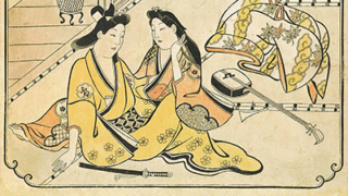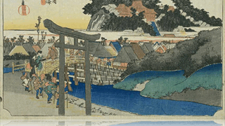 この作品は、二本ずつの松が四組・計八本立っています。そこから覗く富士の絵組みは、富士神霊の在りどころを示す、馬子が富士に視線を送り、富士と東海道保土ヶ谷(品野坂)とを結びつけています。こうして、浮世絵を見る者は、道中、富士との一体感を持つことができると思うのです。
