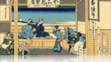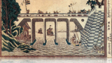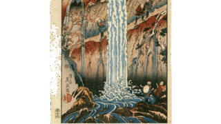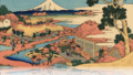 三島越は、山梨と静岡の境にある籠坂峠を越えるあたりだと言われています。中国風に表現された夏雲と藍の濃淡で表現された藍摺(あいずり)で仕上げられた色合いが、夏の爽やかな空気を感じさせます。画面中央に一本大きな木を置いて画面を切る方法も、背景に描かれた富士と絶妙なバランスを保ち、まさに絶品。