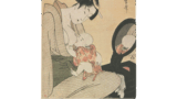 指をさして案内をする茶店の女将と美人の視線を通して、浮世絵を見る者は富士と結びつき、富士世界を茶店の中に見ることができます。二人を乗せてきた駕籠かきが草鞋を木槌で打って柔らかくし、また汗をぬぐう様や、反対側の旅人二人が腰掛けてくつろぐ様子も含めて、富士(神霊)世界ということができます。以上を茶店の入り口の柱が額縁のように切り取り、いくえにも重なる画中画のようになっています。