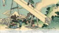 現在の愛知県豊橋市吉田町を描いたもので、吉田城の城下町でにぎわった東海道吉田の風景です。室内を通して見える富士を描く、という珍しい試みがなされた作品です。富士が良く見える茶店で、ひと休みする道中姿の男女、わらじを直す人足、中央に茶店の女中など様々な人の様子が生き生きと描かれています。北斎の人物描写の上手さが見られます。